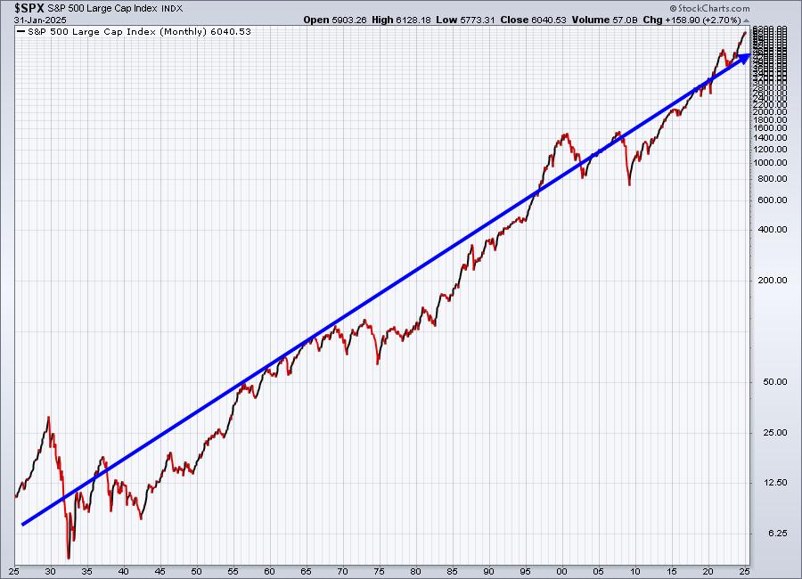Listen, I’m generally a fairly optimistic guy. I tend to see the good in the stock market, while many others continuously focus on potential selloffs ahead. I remain mostly bullish for good reason as the S&P 500 has risen 75% of all years since 1950. It just doesn’t make sense to keep trying to bet against the stock market, especially when you consider the long-term 100-year monthly chart of the S&P 500: